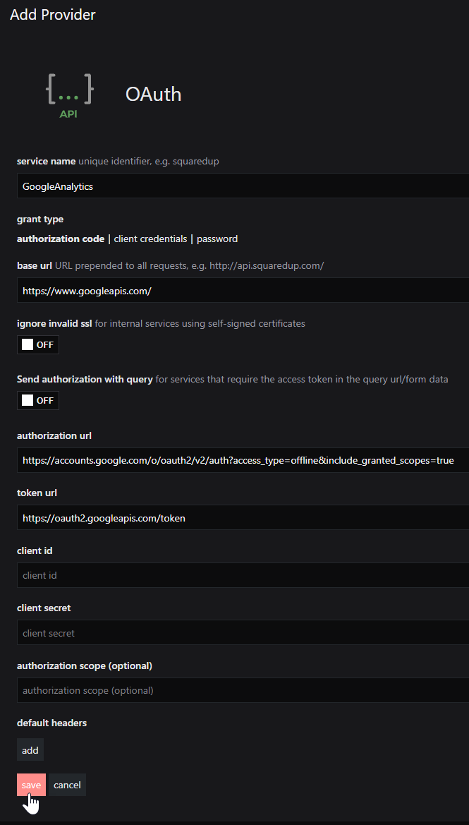 Adding a particular Google API provider is a one-time configuration task, and once you have that Google API provider configured you can use it with multiple tiles. The instructions below use the example of the Google Analytics API, but can be used to create providers for other Google REST APIs.