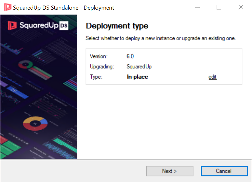 - Leave the default install type as In-Place. Check the correct SquaredUp DS instance is going to be upgraded. You can click edit to see more details.  Click edit on the Deployment Type screen if you wish to change the install: - Side-by-side - This migrates your dashboards to a new instance of the new version, but leaves your old instance as it is.