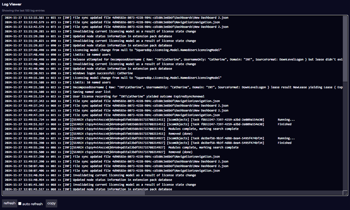 The log viewer shows the last 100 log entries on-screen. You can refresh the view, or set it to auto refresh, as well as copy the details.