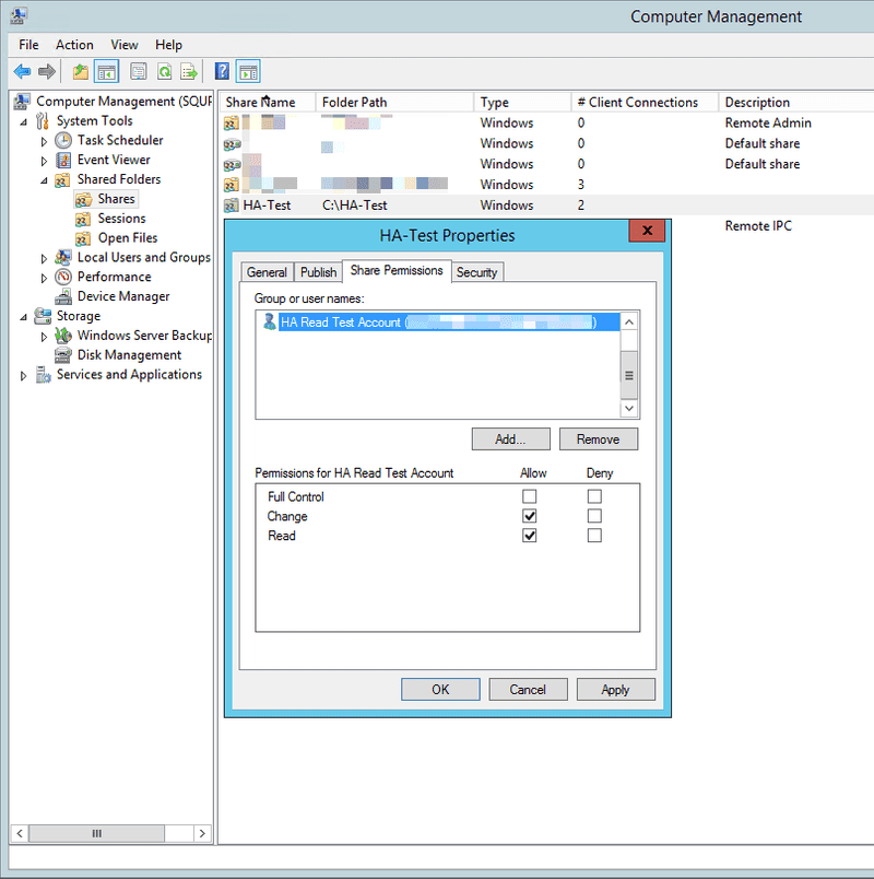 Before configuring HA it is important to check the permissions on the share itself. The share has its own permissions which cannot be viewed via Windows Explorer, and they always take precedence over the file and folder permissions. If the SquaredUp DS application pool identity (How to check and modify the application pool identity) is not allowed to read and change, then the permissions added to the folders by the SquaredUp command are overridden/ignored by the share, and SquaredUp DS will fail to start with an 'Access denied' error.