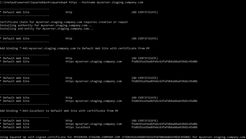 SquaredUp5. - After a few seconds a certificate will be generated and installed, with the web server bindings updated to match: